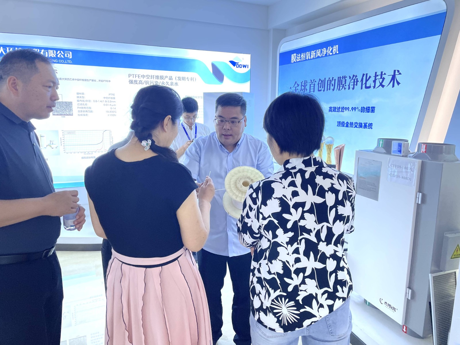 公司展厅,总经理钱建斌、副总经理金王勇为焦瑞河主席一行详细介绍了公司成立以来立足诸暨市为发展战略支点,进行绿色环保建设,推动各地区绿色低碳高质量发展中所做出的突出贡献和企业发展成果。